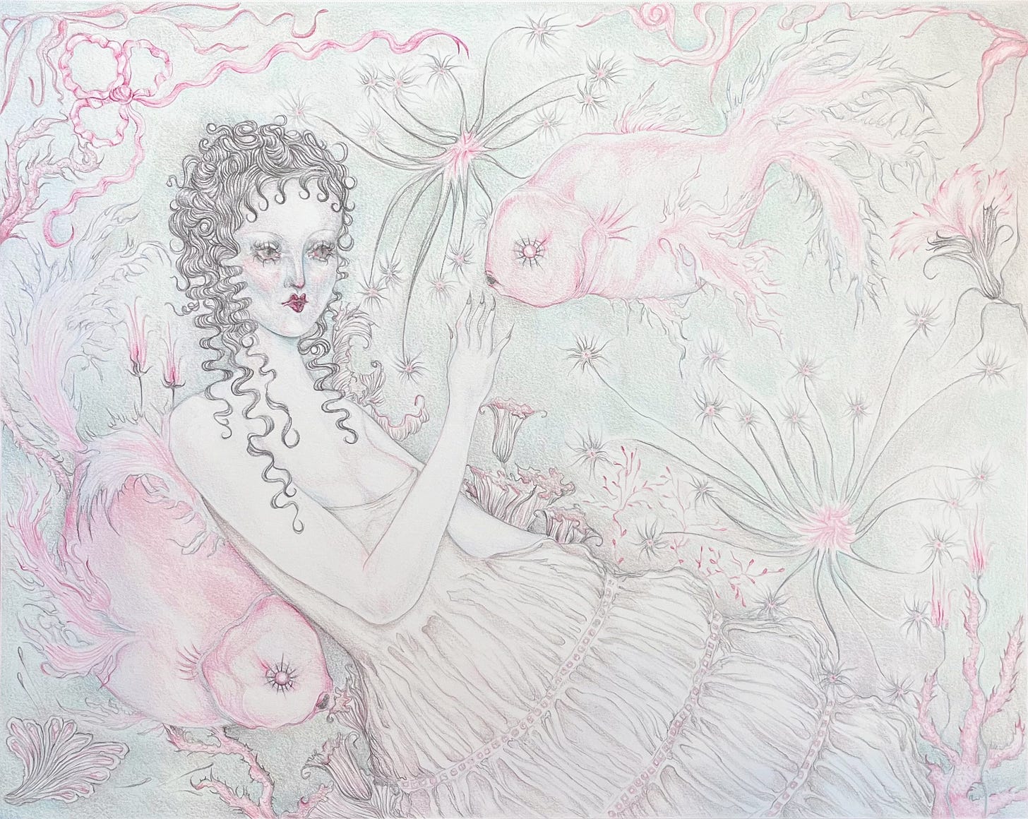 I’m a mixed-media artist inspired by decadent fairytales, painted ladies, and kitsch artifice. Wilted vamps and indulgent femme eroticism haunt my illustrations.